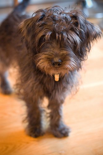 Yorkie Poos are very small dogs. Usually the longer and curlier the fur the quicker this matting occurs. This style is achieved with scissors alone.